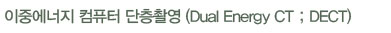 이중에너지 CT란 서로 다른 2가지 에너지빔을 발사하는 두개의 헤드를 90도 간격으로 배치하여 각각의 헤드에서 나온 에너지빔으로 부터 얻어진 정보를 대조하여 수학적으로 영상을 재합성하는 방법으로 최근 여러 질병의 진단과 치료에 획기적인 도움을 주는 첨단 영상진단장치입니다. 통풍의 진단에 있어서도 말단 관절 뿐만 아니라 몸 속 깊은 곳에 존재하는 요산 결절을 쉽게 찾아낼 수 있으며 경우에 따라서는 분석에 방해가 되는 뼈조직의 영상을 제거하고 요산 결절의 위치와 크기를 정량적으로 평가하여 치료의 효과를 추적할 수도 있습니다.